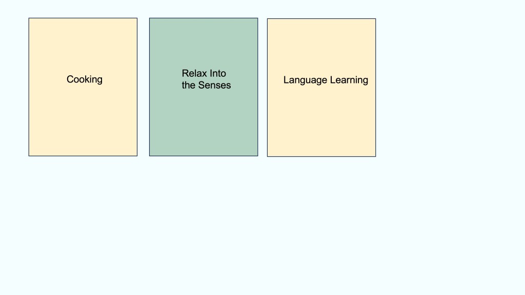 Consider any Abilities cards you may have created. It is ok to create some additional ones now. Once you have done this, “play” your cards. Always plays the Relax Into the Senses card in the middle and your Skill cards on either side. In this example, the Player cooked, studied language and listened to the Relax Into the Senses audio so she plays her cards like this: